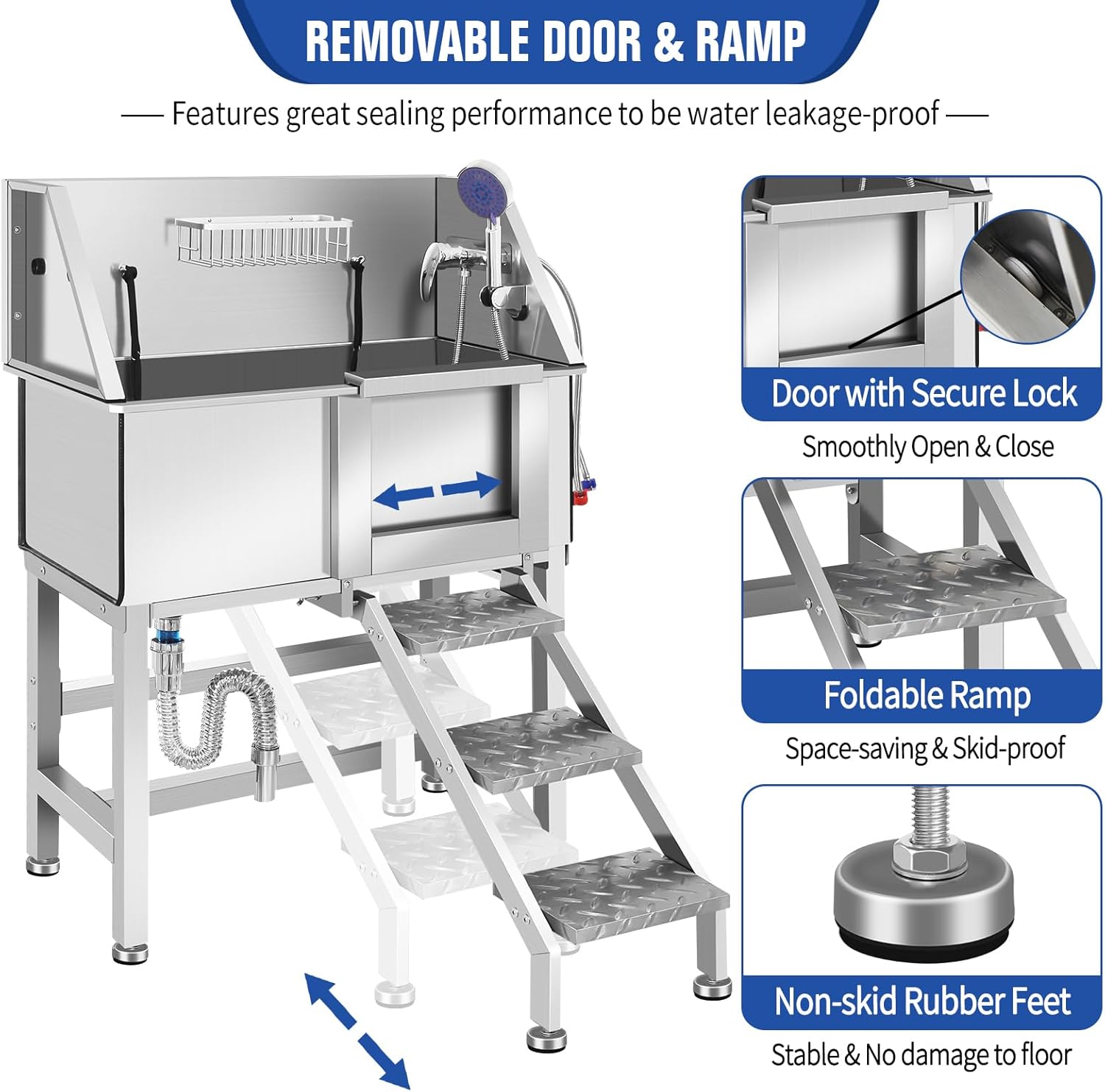 Stainless Steel Dog Washing Station for Large Dogs, Dog Grooming Tub for Home, Professional Dog Bathtub Bathing Station, Pet Wash Station, Dog Shower Tub with Stairs, Drain & Door,34" R-RAMP