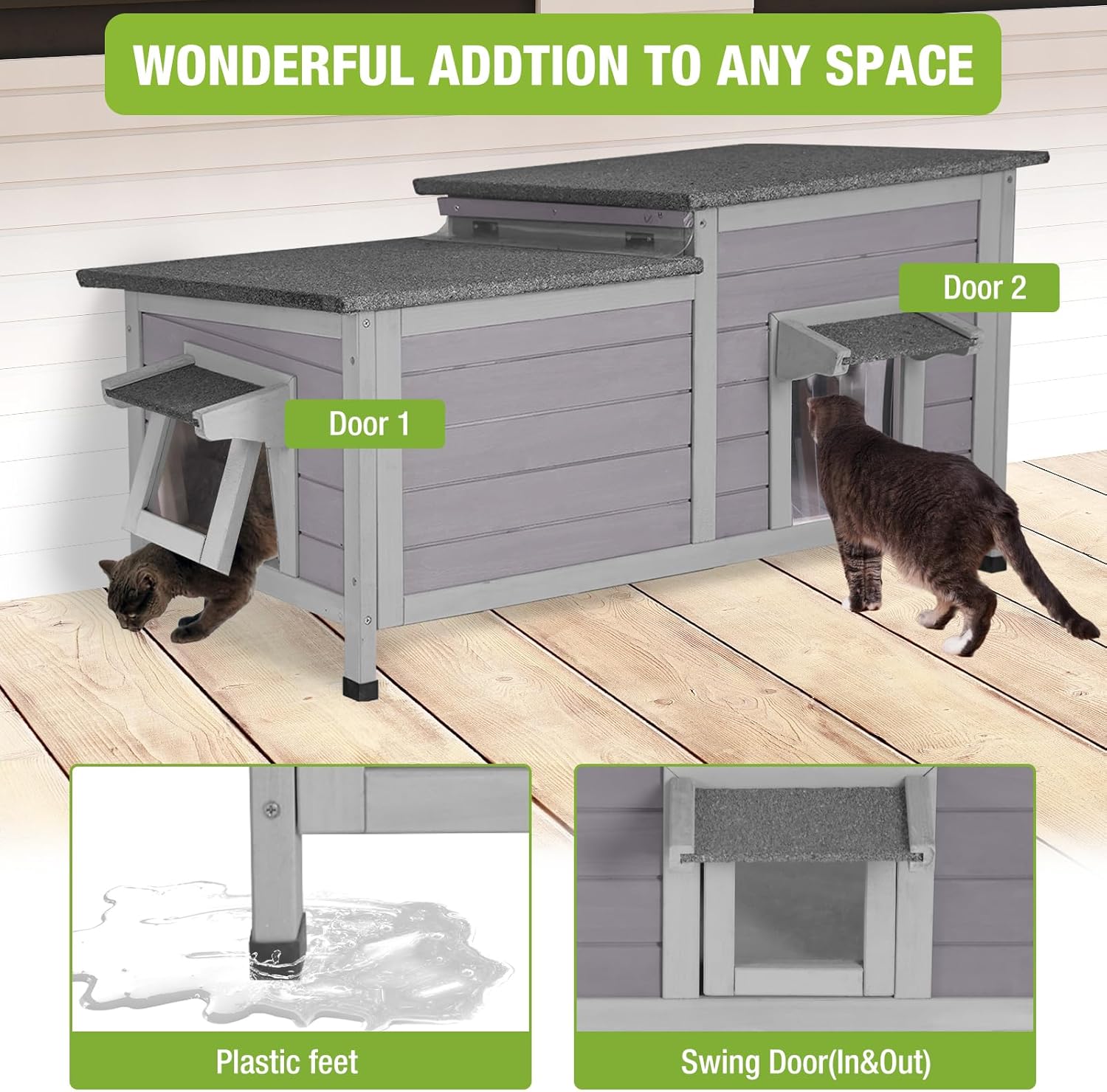 - Spacious Dual-Room Design Measuring 39.1"L x 18.5"W x 19.1"H, this outdoor cat house offers ample space for 2–3 cats or small animals. Its two-room layout and large opening roof provide comfort and easy access for multiple pets.
