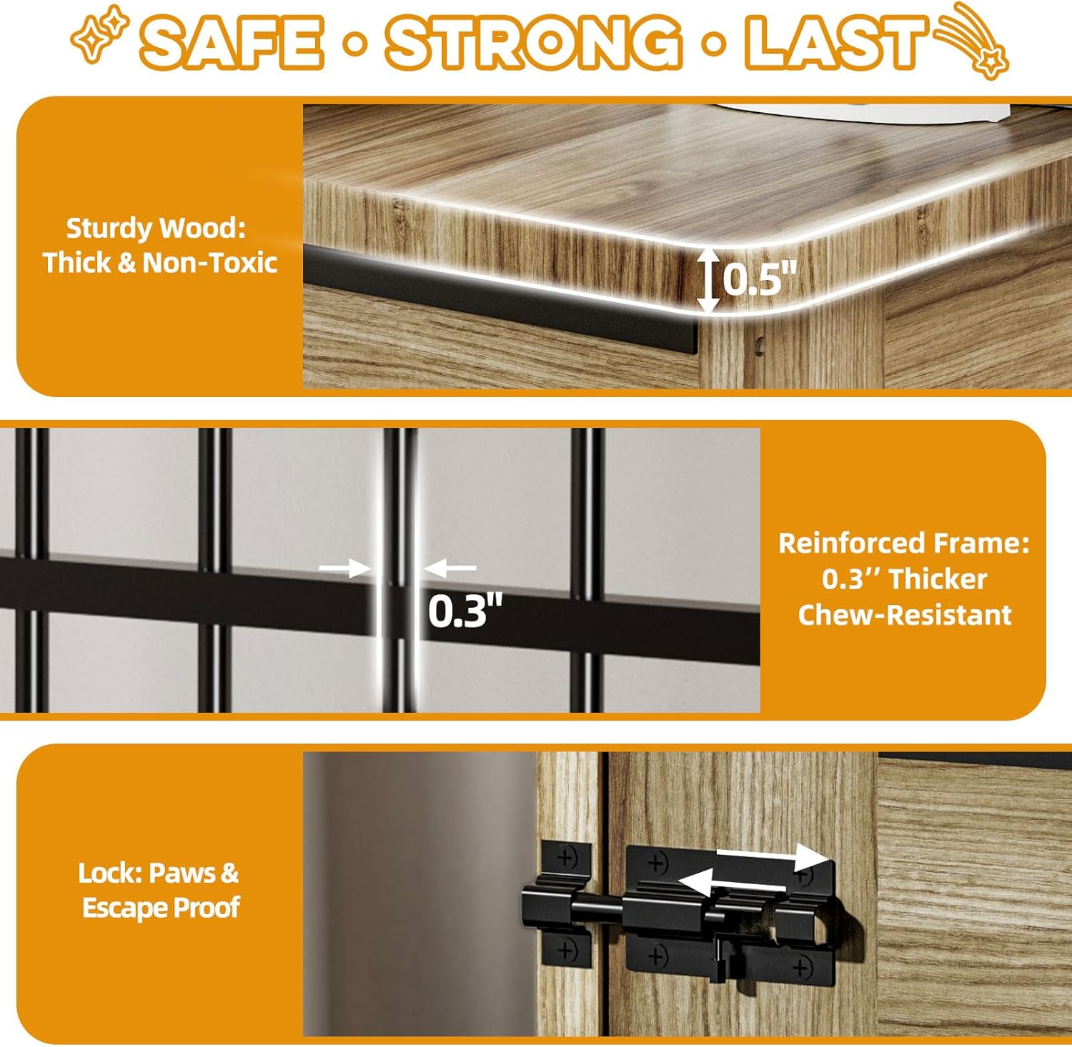 • Chew-Resistant & Durable Structure: Built with 0.3" reinforced steel bars and a 0.5" thick solid wood base. Supports long-term use without warping or breaking—even with energetic large dogs