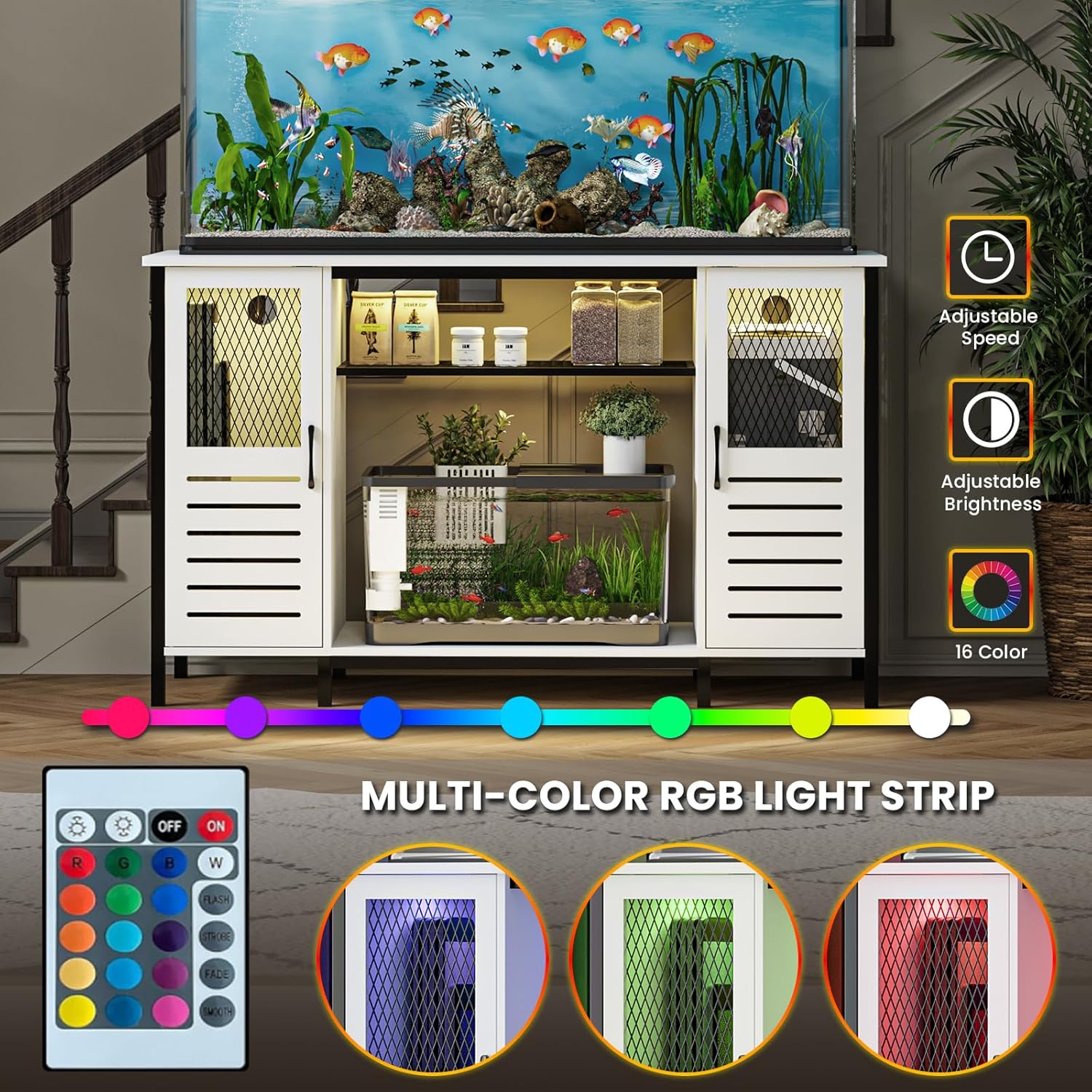 EAG 55-75 Gallon Fish Tank Stand with Power Outlets & LED Light, Heavy Duty Aquarium Stand with Adjustable Shelves, Turtle Reptile Terrarium Tank Stand with Cabinet, 1250LBS Capacity, White